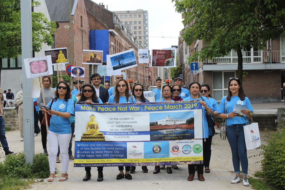 May 18, 2019, Leuven, Belgium – On the occasion of 2563rd birth anniversary of Lord Buddha, Lumbini-Kapilvastu Global Campaign, Belgium (LKGCB) organized Peace March 2019 in Leuven, Belgium in association with Embassy of Nepal in Belgium, Non-resident Nepalese Association (NRNA), Belgium and Kabhrepalanchok Aid Committee, Belgium.